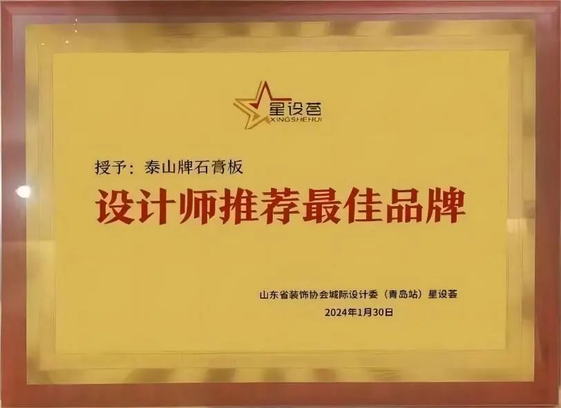 大会现场,一张张高颜值、高品质的泰山牌石膏板获得了协会专家和业界设计师们的一致好评,泰山牌石膏板成功获评由山东省装饰协会城际设计委(青岛站)颁发的“设计师推荐最佳品牌”。