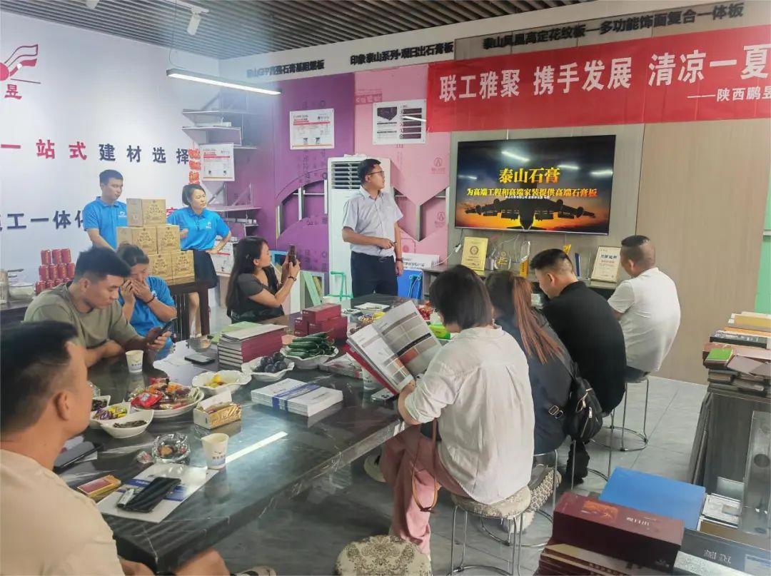 在工作人员陪同下,合作伙伴参观了泰山石膏展厅,深入了解泰山石膏的企业发展历程、品牌建设成果、技术创新优势以及生产布局情况,对泰山石膏的企业实力表示认可。